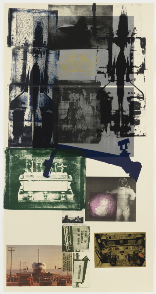Consider another piece about astronauts — Hot Shot, by Robert Rauschenberg, from 1983. Rauschenberg is taking other images, whole, and putting them into a new arrangement, suggesting a new work.